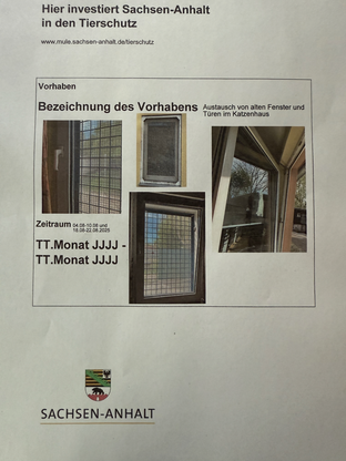 Mit Unterstützung der Förderung des Landes Sachsen-Anhalt konnten wir in diesem Jahr die alten, teils noch aus DDR-Zeiten stammenden und defekten Fenster unseres Katzenhauses austauschen. Einige ließen sich kaum noch öffnen – nun sorgen moderne, energieeffiziente Fenster und Türen sowie neue Jalousien für ein deutlich besseres Klima in den Katzenstuben.
