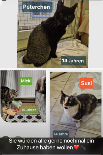 Diese drei älteren Katzen suchen dringend ein schönes Zuhause, wo sie ihren Lebensabend verbringen können. Sie sind alle drei medizinisch untersucht und für ihr Alter tipptopp und wollen einfach nur geliebt und gekuschelt werden.